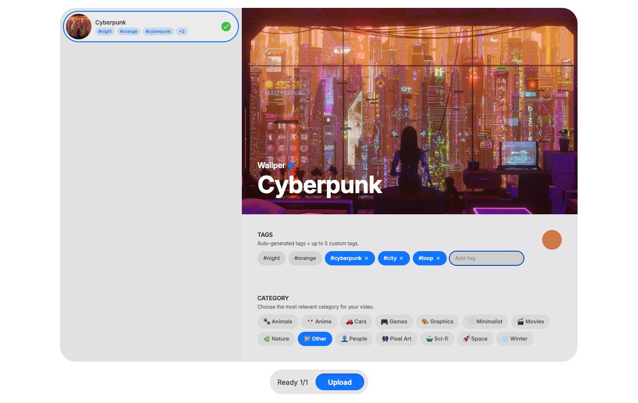 Wallper’s Upload page lets everyone contribute looping videos to the community library. Simply configure all the necessary information about your video before it is shared with the world. This guide covers uploading, file requirements, the moderation process, and how to use declined items locally via My Media → Add Video.